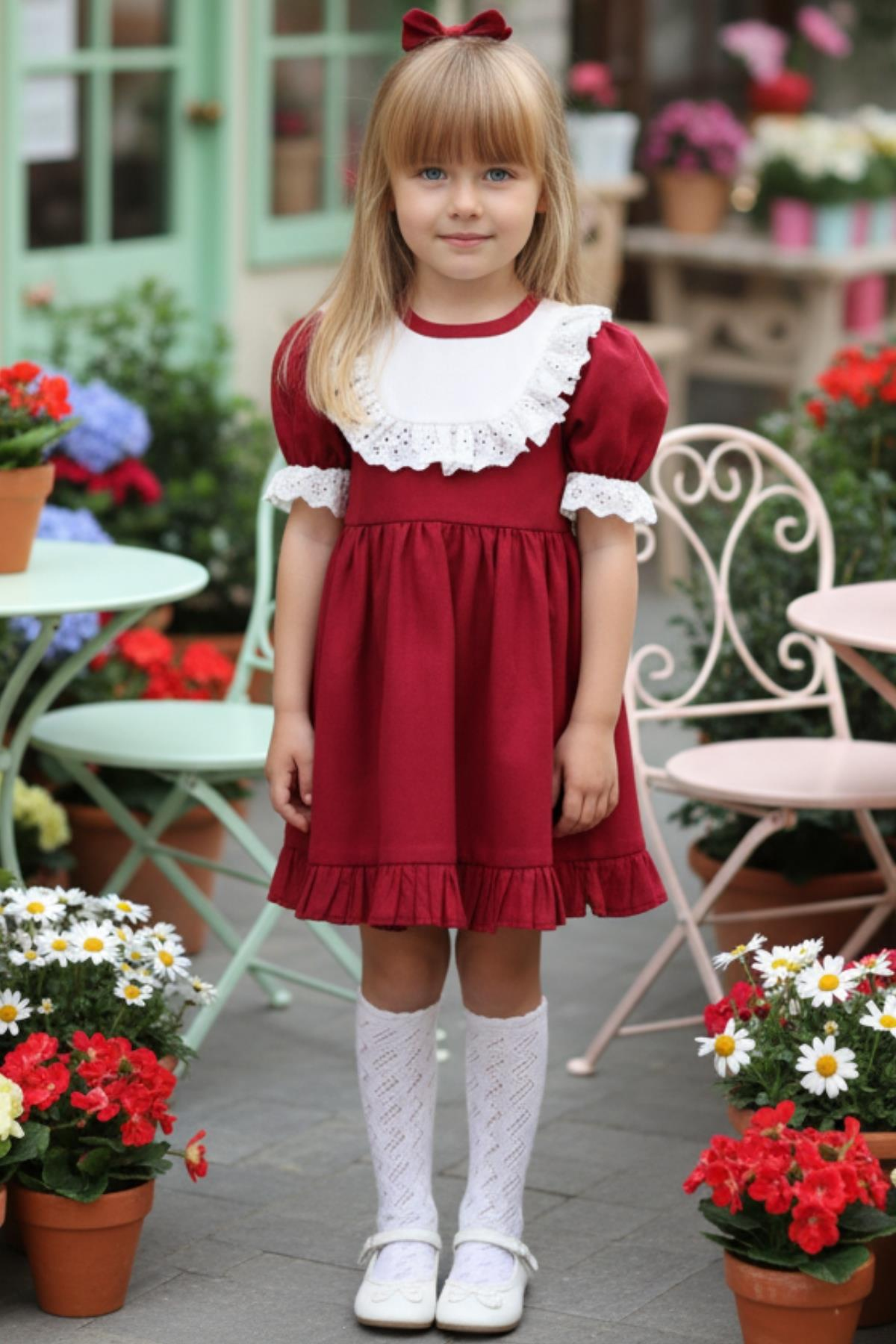 Kız Çocuk Bordo Ruby Fırfırlı Dantel Detaylı Kısa Kollu Elbise Bandana Takım ELB-0070.6