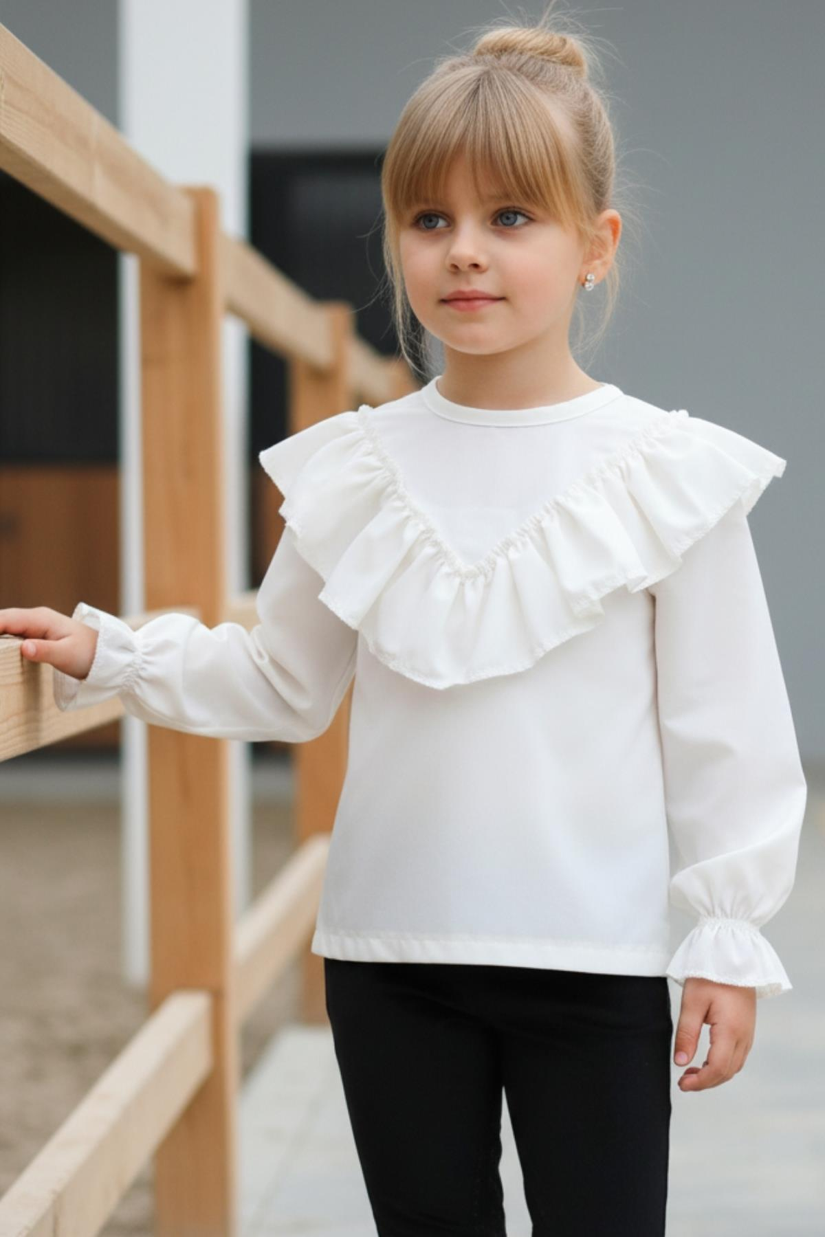 Bluz, ekru renkli, Bisiklet yakalı ve uzun kolludur; omuzlarında ön kısmında ve kol uçlarında şık fırfır detayları bulunmaktadır. Kumaşı yumuşak ve nefes alabilir yapısıyla çocuklar için idealdir.
