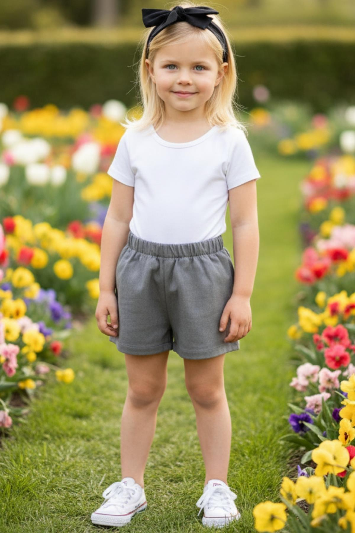 Kız Çocuk Gri Jean Şort Siyah Dev Fiyonk Bandana