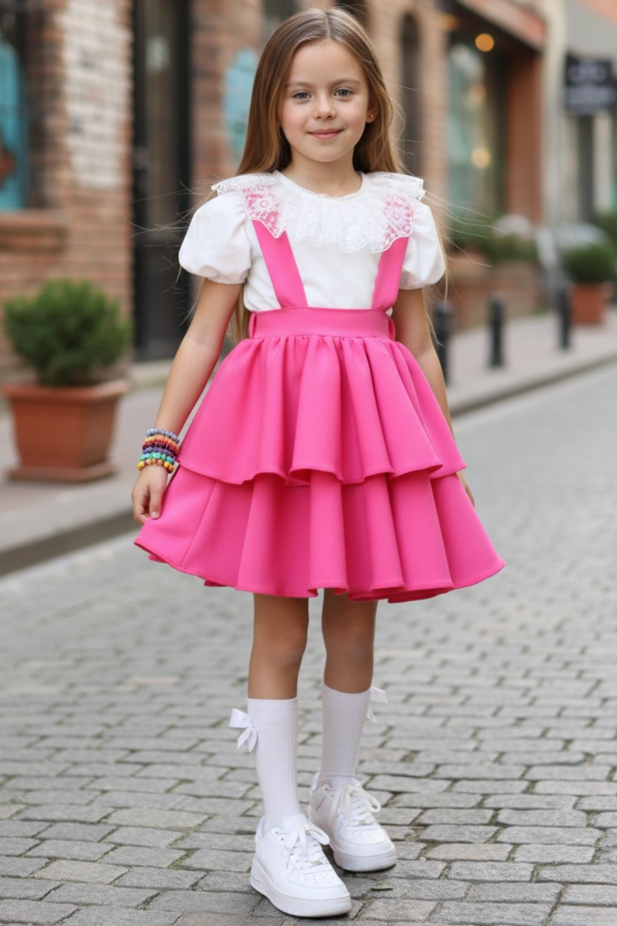 Kız Çocuk Helen Pembe Askılı Kat Kat Bağlama Jile Elbise Dantel Detay Ekru Kısa Kollu Bluz Takım TKM-0181.3