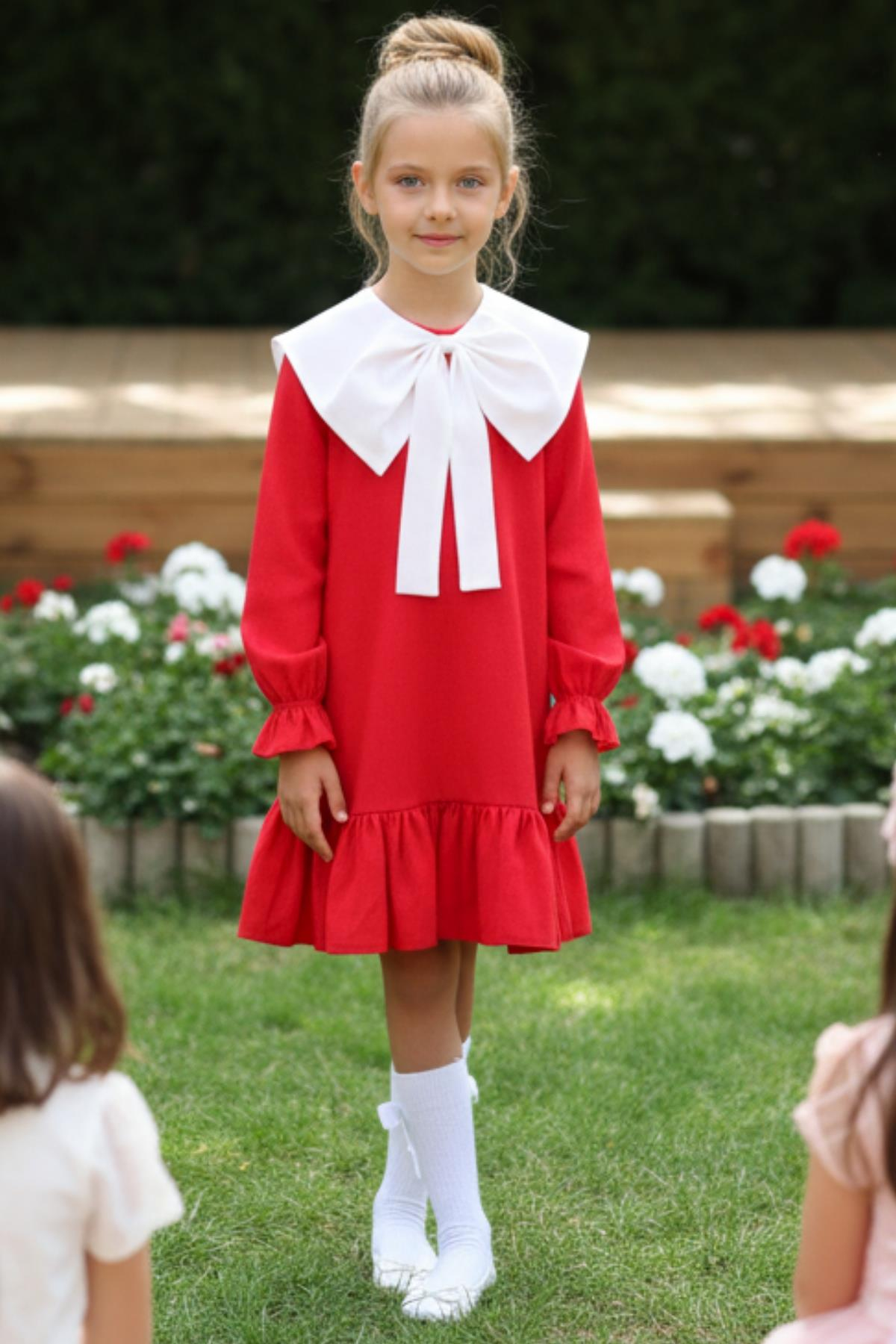 Kız Çocuk Rashel Kırmızı Yakalı Fırfırlı Uzun Kol Keten 23 Nisan 29 Ekim Gösteri Elbisesi