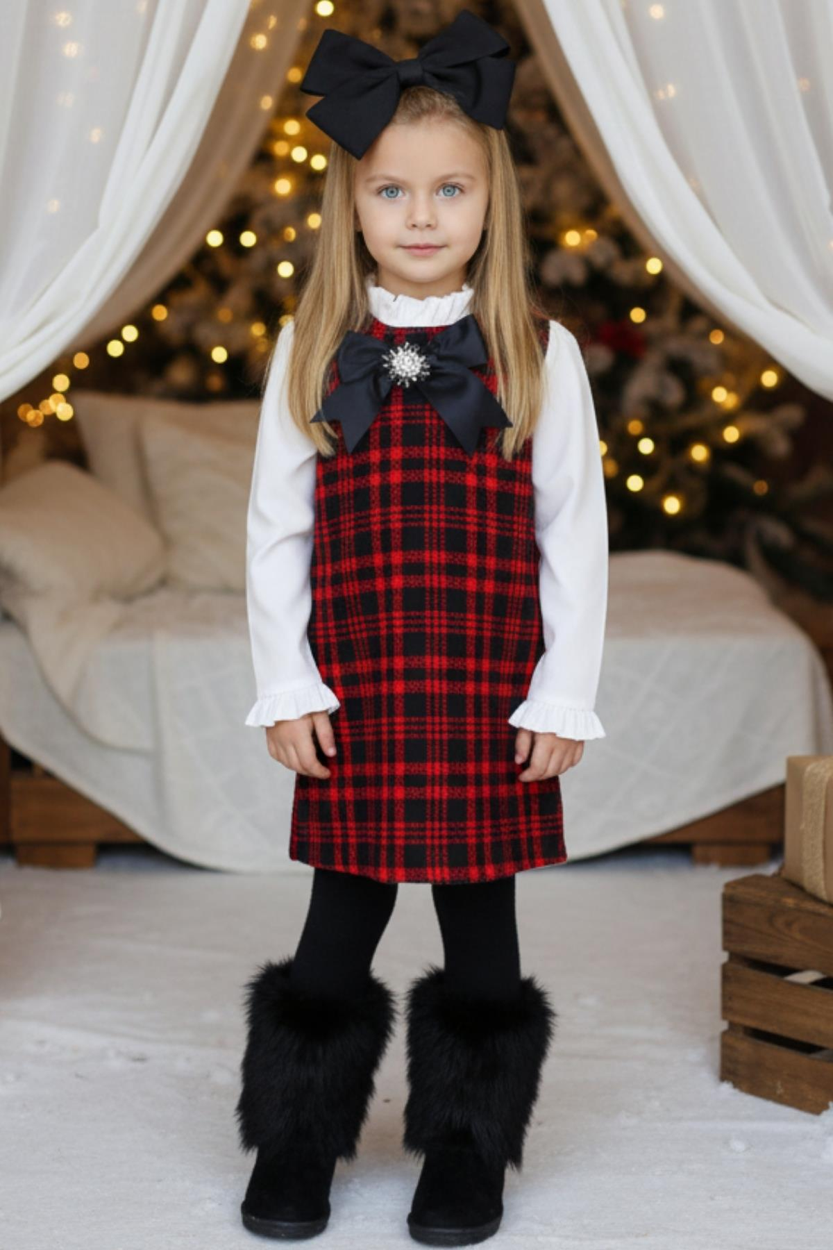 Kız Çocuk Vanessa Broş Detaylı Tüvit Kırmızı Uzun Kollu Yılbaşı Elbisesi ELB-0082.3