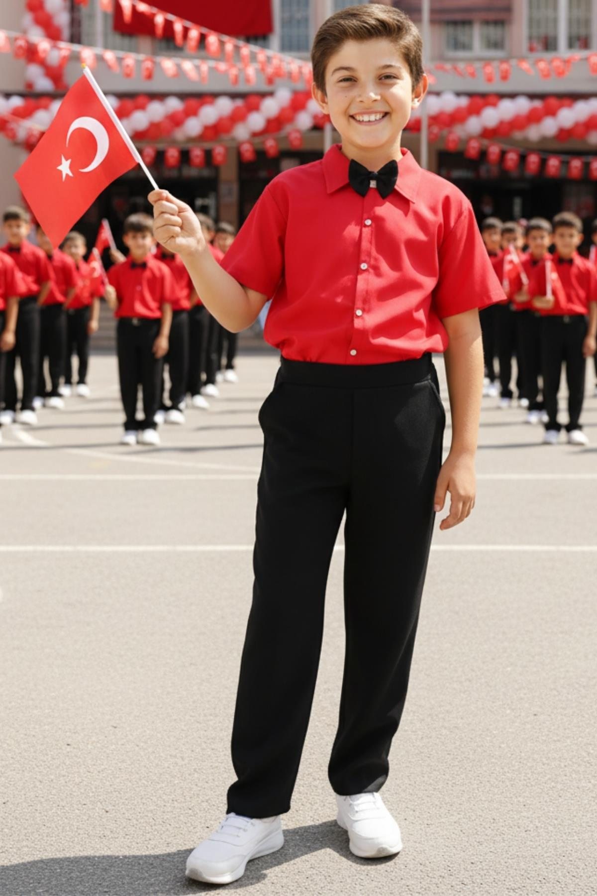 Bu ürün, görseldeki gibi kısa kollu gömlek, pantolon ve lastikli papyon olmak üzere üçlü takım halinde satışa sunulmuştur. Ürün, gömlek, pantolon ve papyon birlikte gönderilecektir.